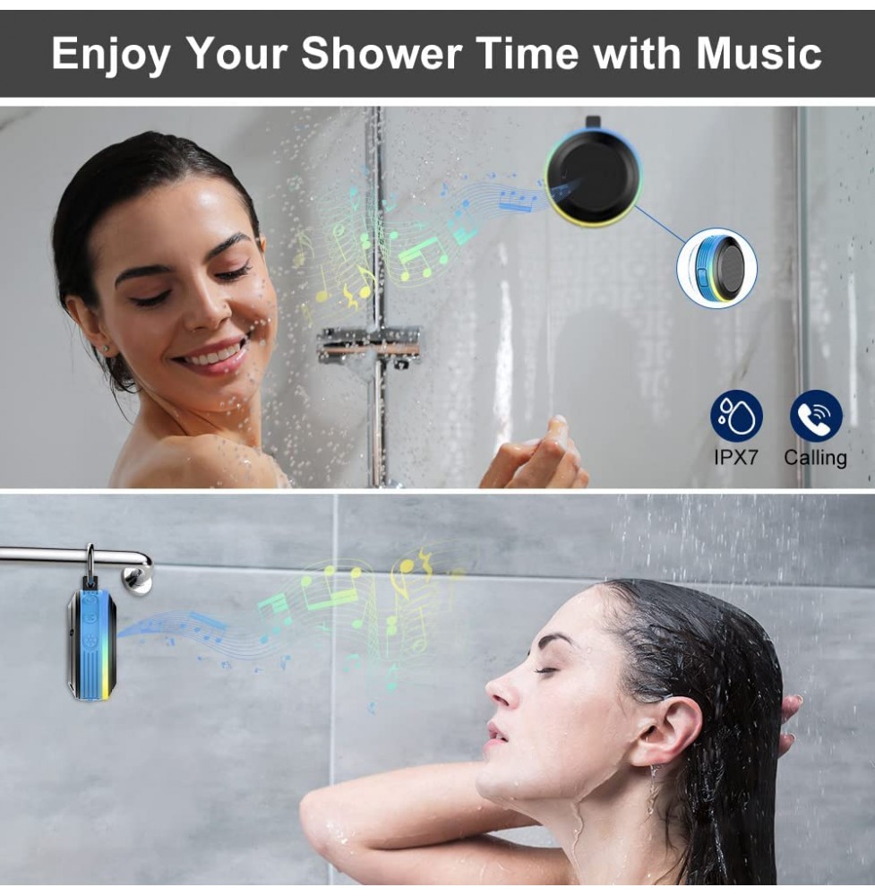 Bluetooth Shower Speaker, IPX7 Waterproof Portable Speaker with LED Light, Suction Cup, Hook, Stereo Sound, True Wireless Stereo Mini Speaker with Built-in Mic, FM Radio, for Bathroom, Pool, Outdoors