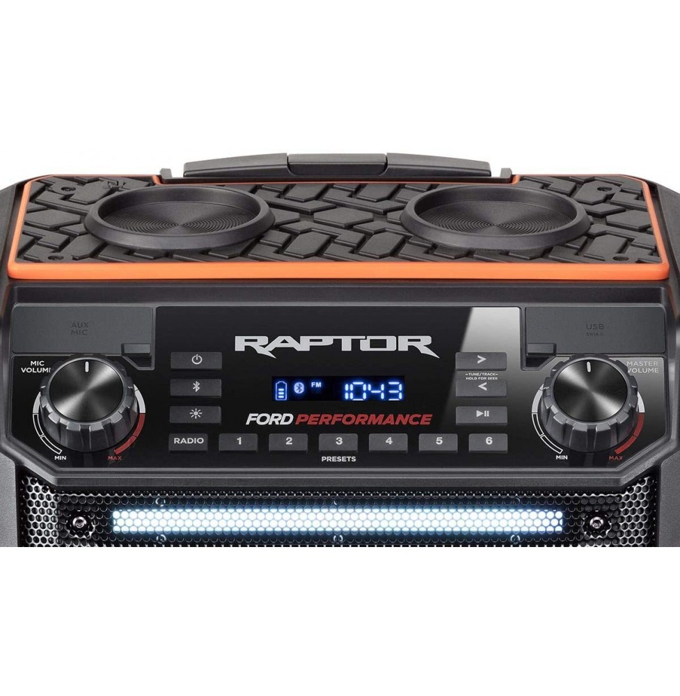 When high-powered outdoor fun is the order of the day, then the rugged Ford pickup-styled Raptor is the answer. Here is a powerful speaker with Bluetooth technology, a powerful 100-watt 8-inch 2-way sound system and a sensitive AM/FM radio. In true pickup fashion, the Raptor is clad in an “all-terrain tire” rubber-tread body that perfectly evokes the feel of the stylish Ford pickup. Dual cup holders on top deliver real convenience while furthering that “automotive” feel.