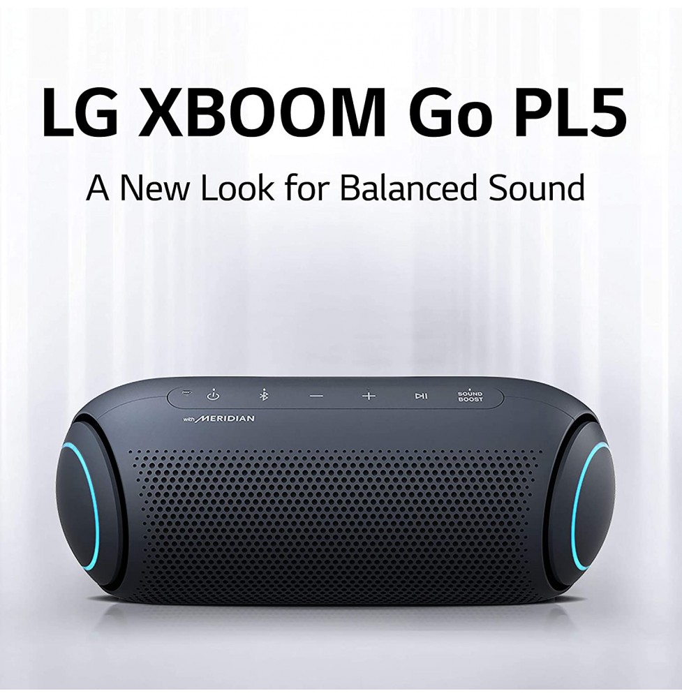 LG XBOOM Go Speaker PL5 Portable Wireless Bluetooth, Dual Action Bass, Sound by Meridian, Water-Resistant, Sound Boost EQ, 18 Hour Battery Life, LED Lighting - Black